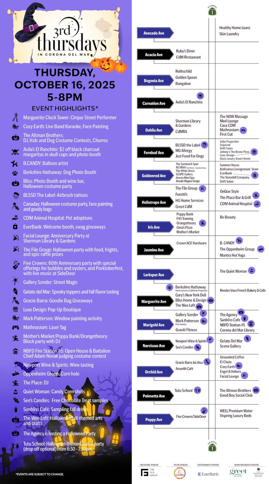 As announced in August 2025, 3rd Thursdays has officially evolved into a seasonal event series held 3x-per-year, on the 3rd Thursdays of April, July, and October. This new cadence builds on the incredible growth and community support from over 70 local businesses, The File Group, Visit Newport Beach, the Corona del Mar Chamber of Commerce, Greet Corona del Mar Magazine, and countless residents, allowing for even more engaging, high-quality experiences each season.